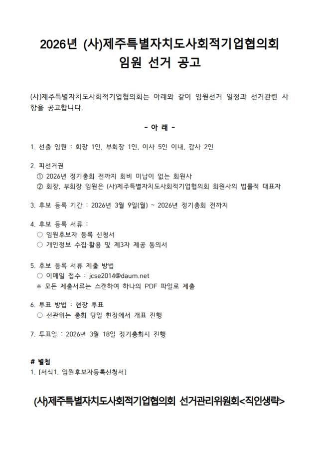 제목 2026년 (사)제주특별자치도사회적기업협의회 임원 선거 공고